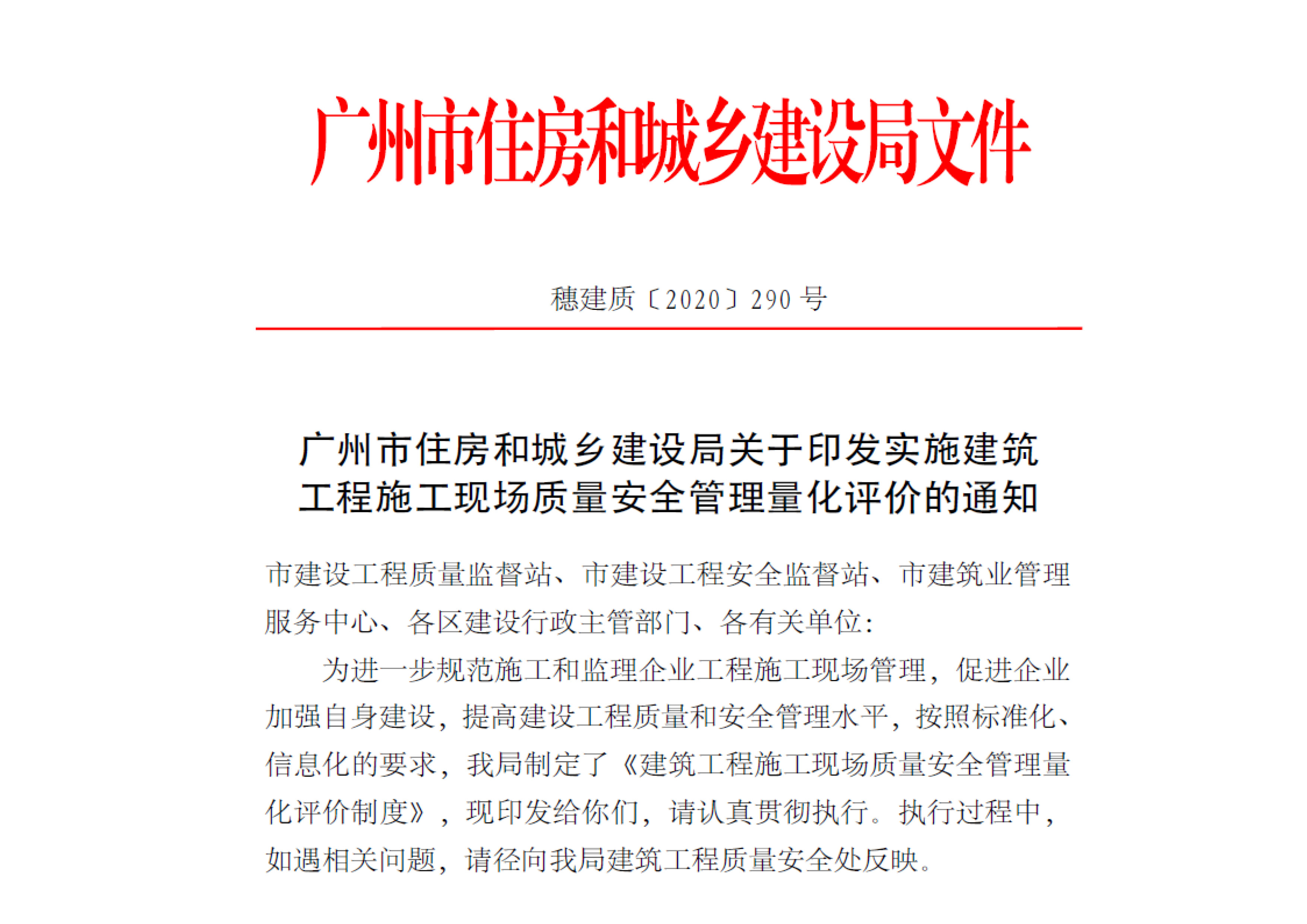 廣州市住房和城鄉(xiāng)建設(shè)局關(guān)于印發(fā)實(shí)施建筑工程施工現(xiàn)場(chǎng)質(zhì)量安全管理量化評(píng)價(jià)的通知